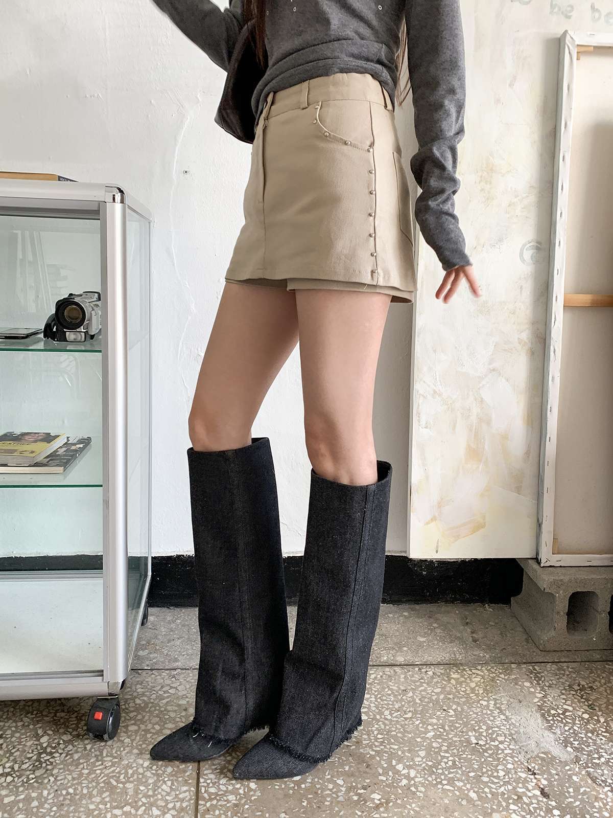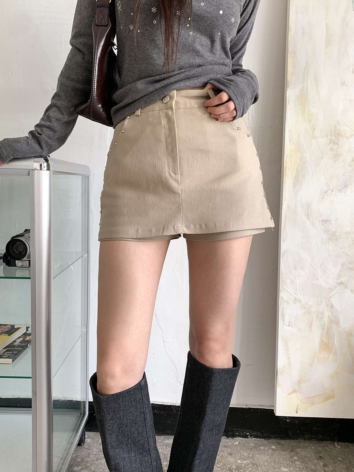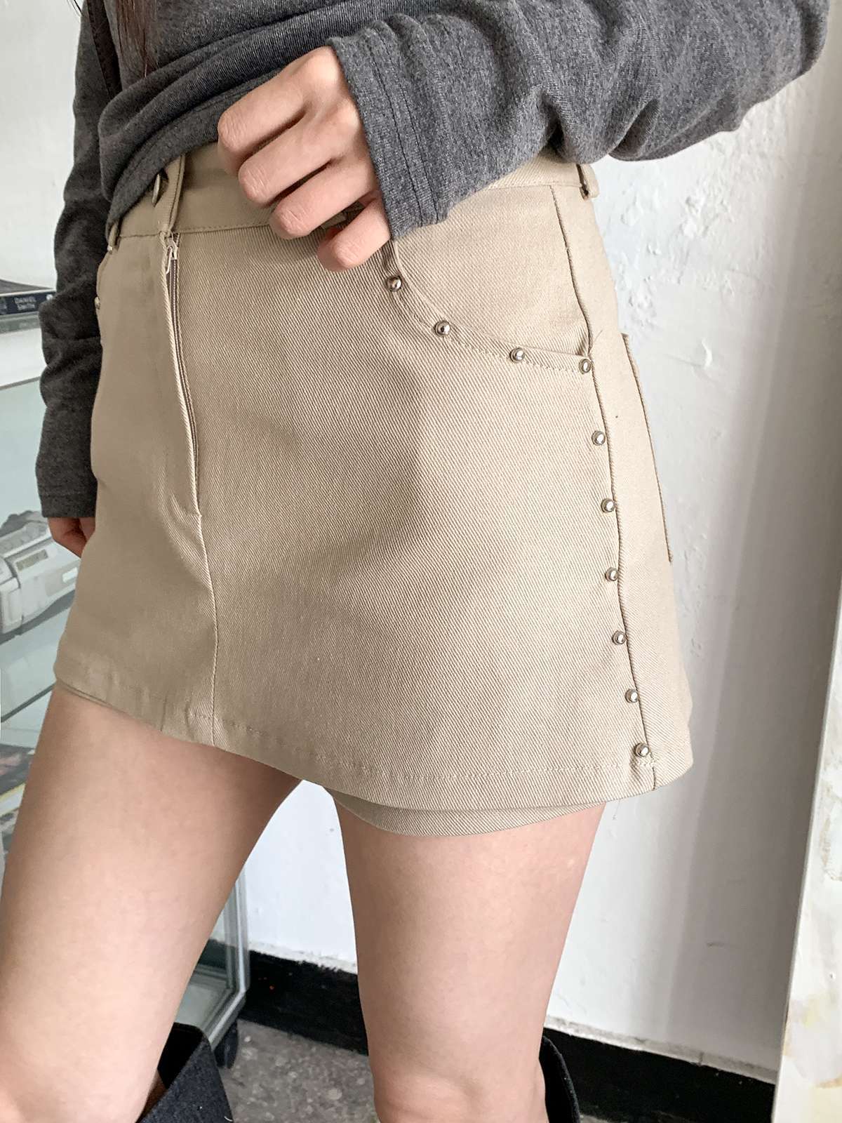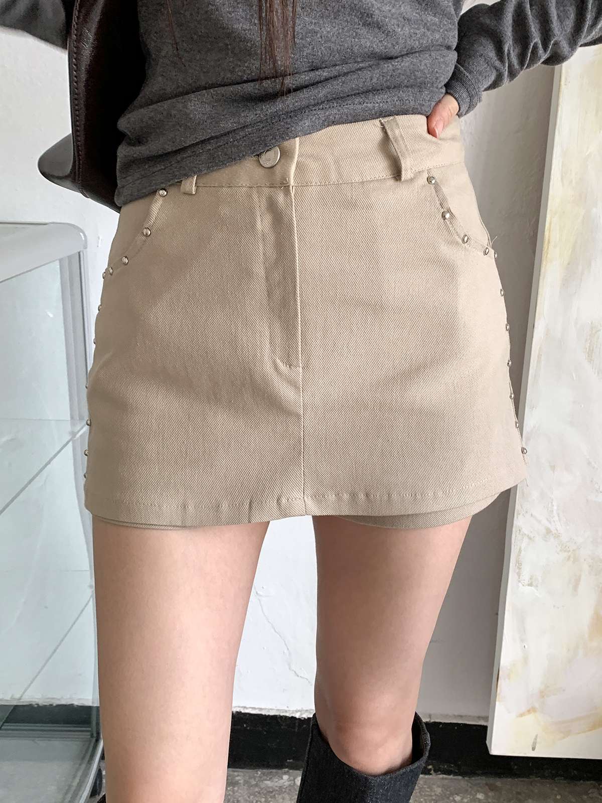 빈티지하고 힙한 무드의 스터드가 들어간 치마바지