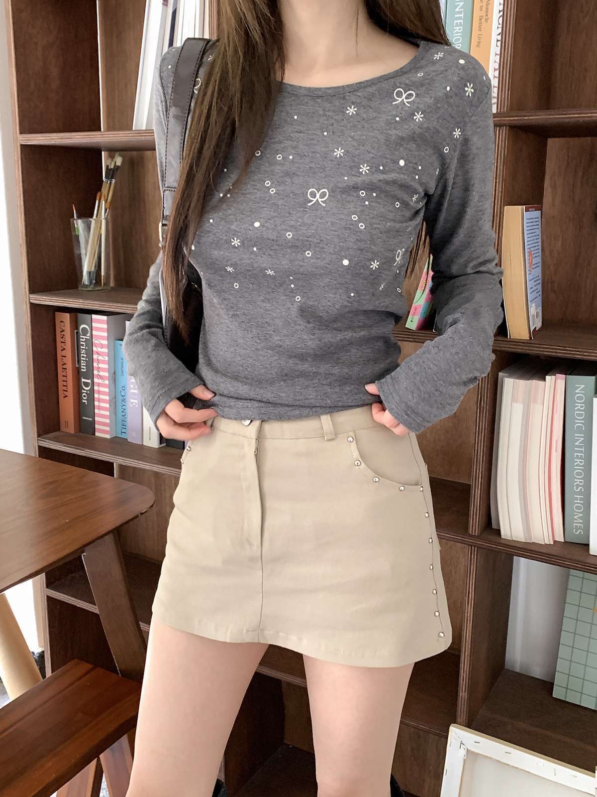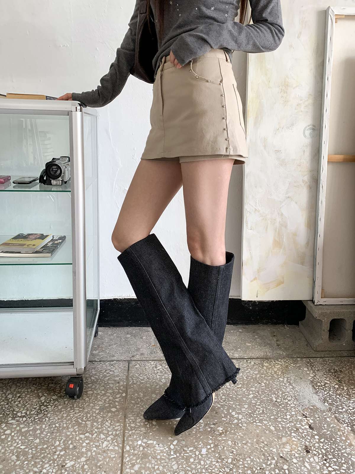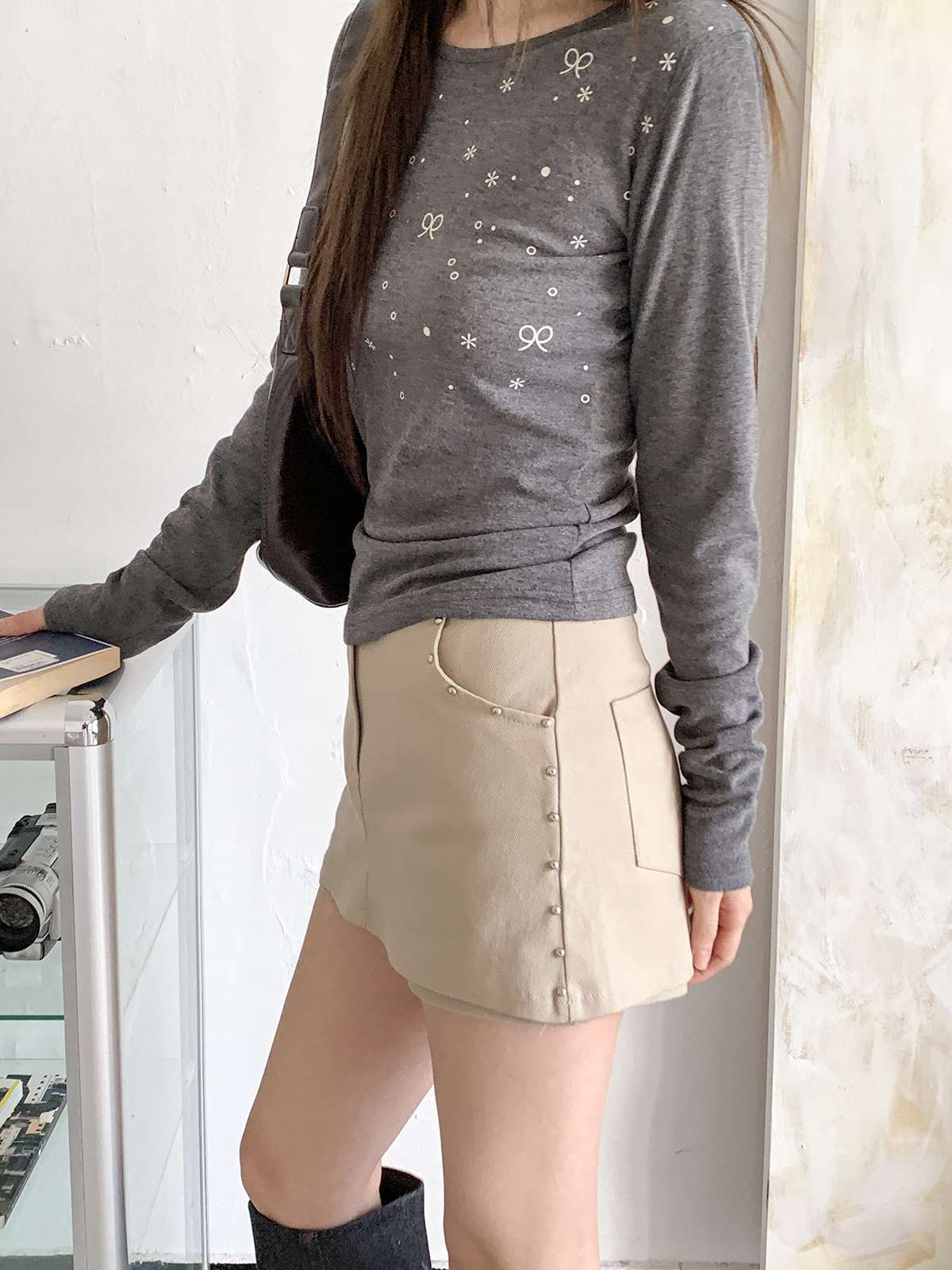 빈티지하고 힙한 무드의 스터드가 들어간 치마바지
