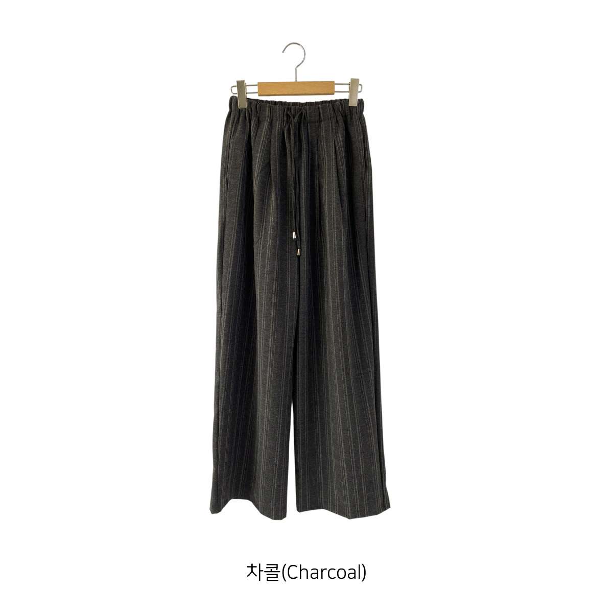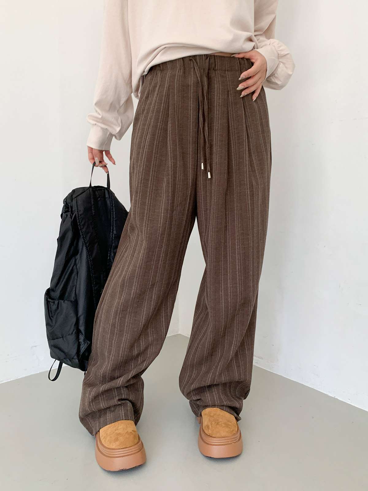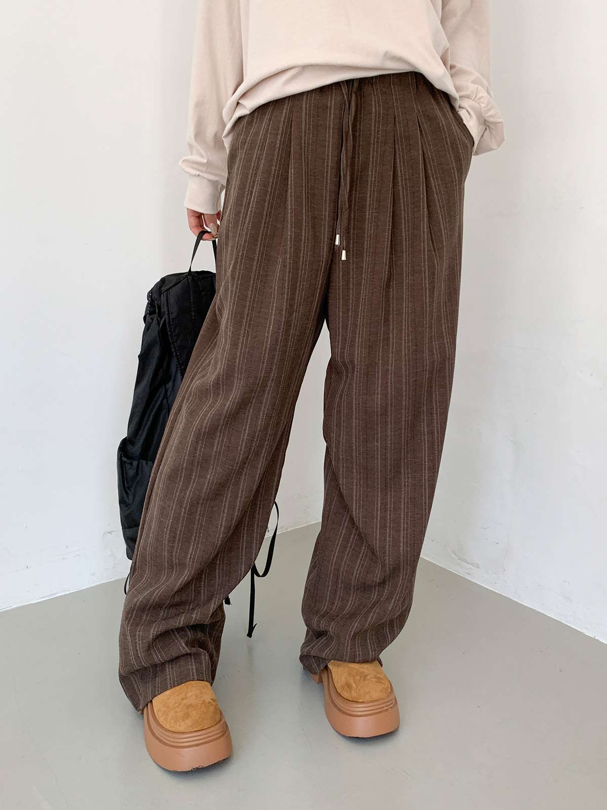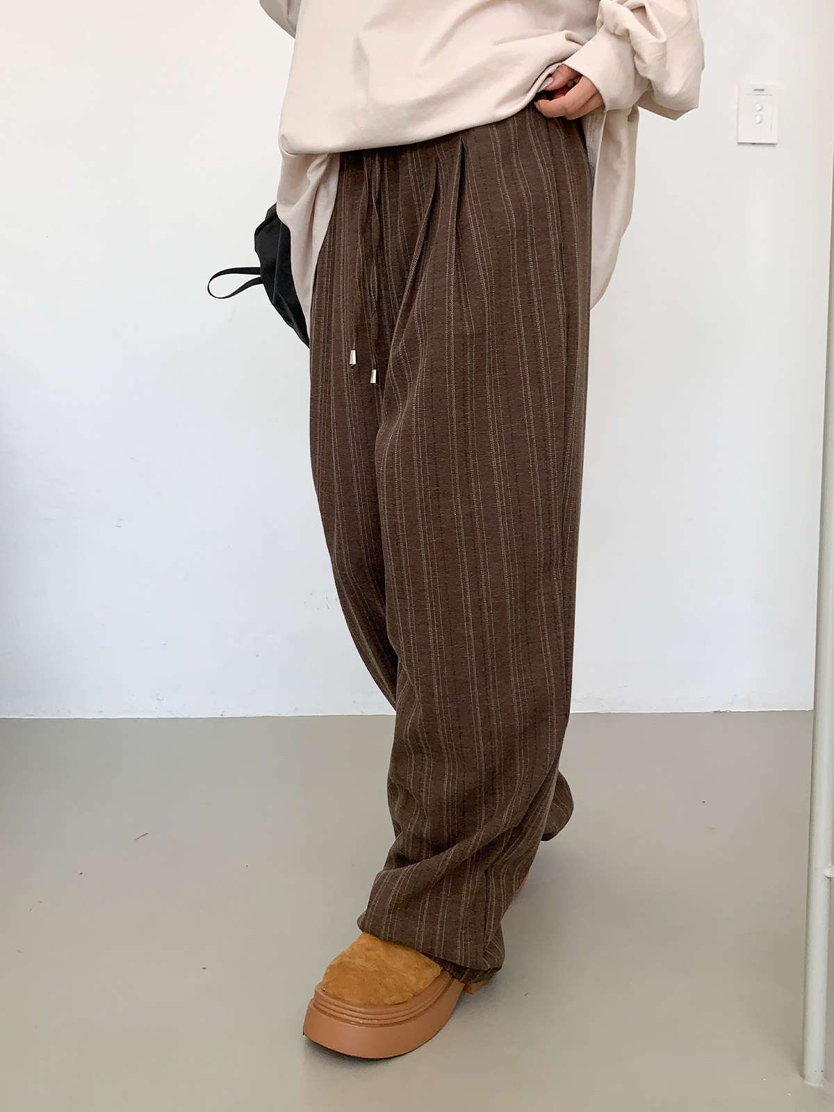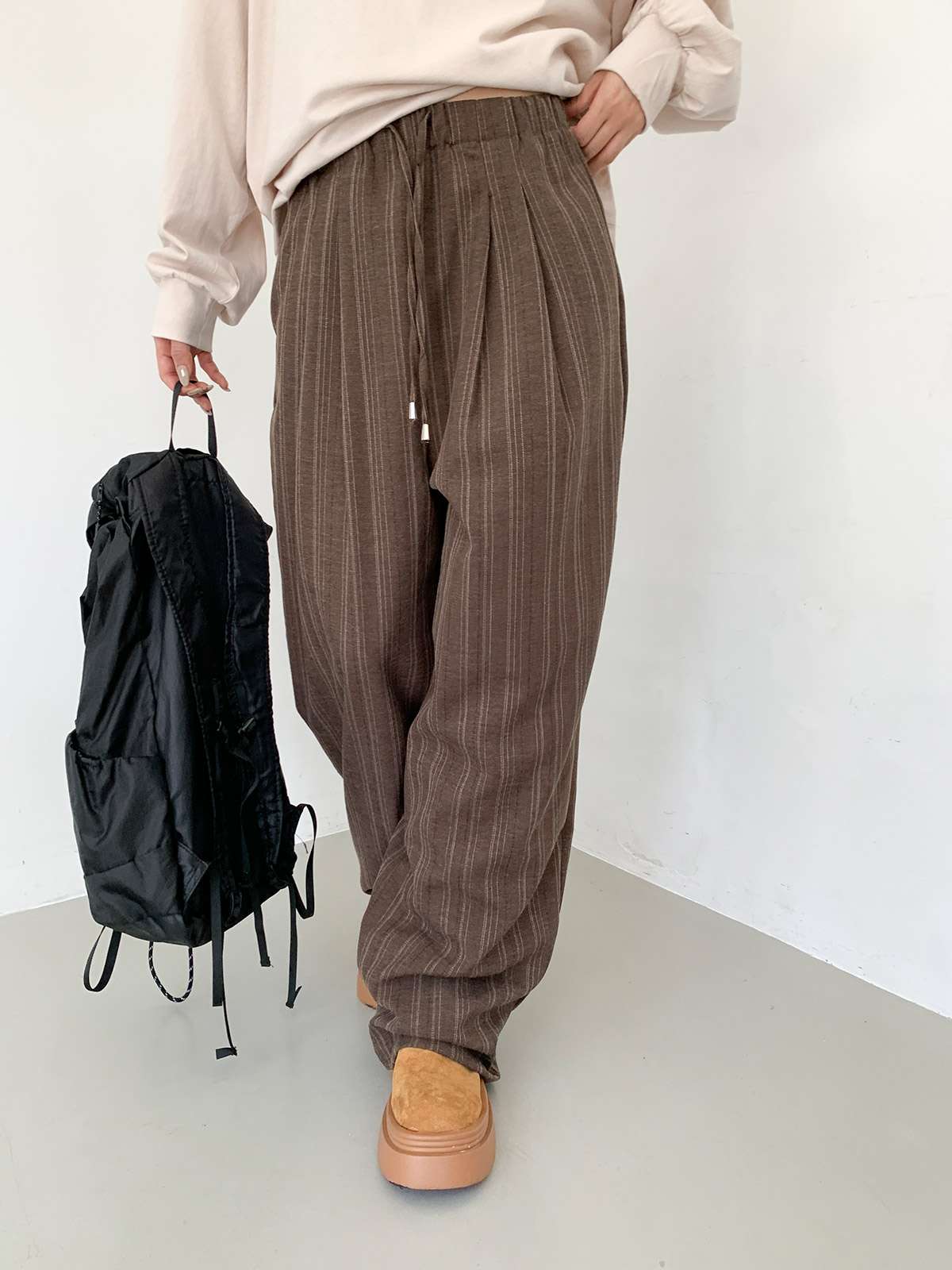 와이드한 핏의 스트라이프 패턴이 포인트인 밴딩 팬츠
