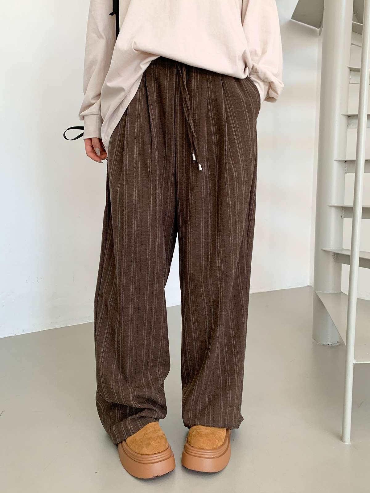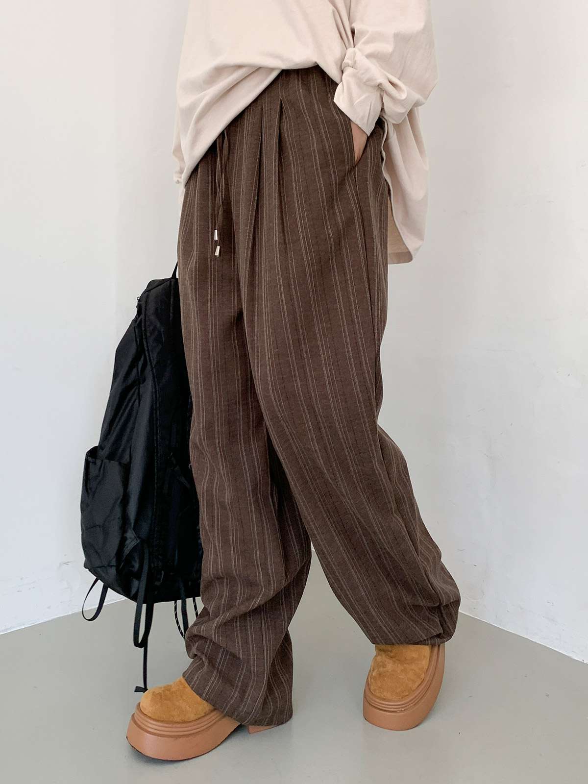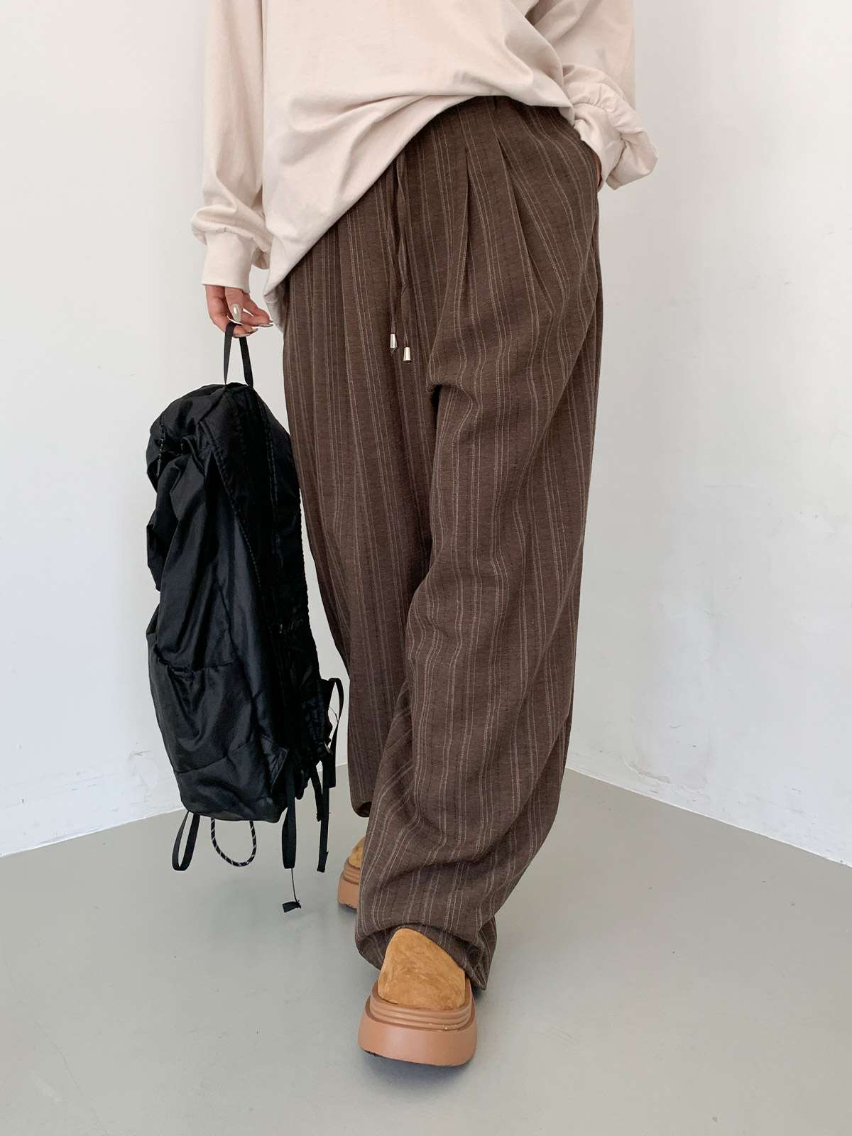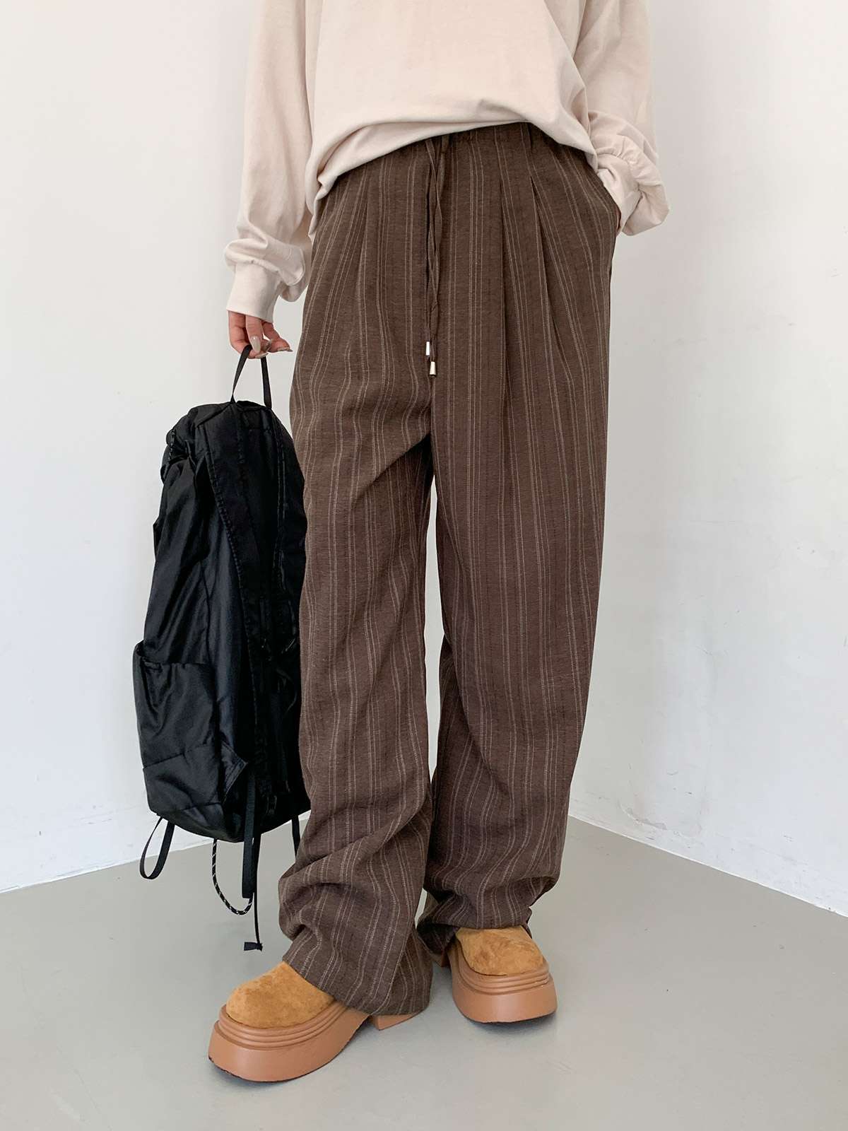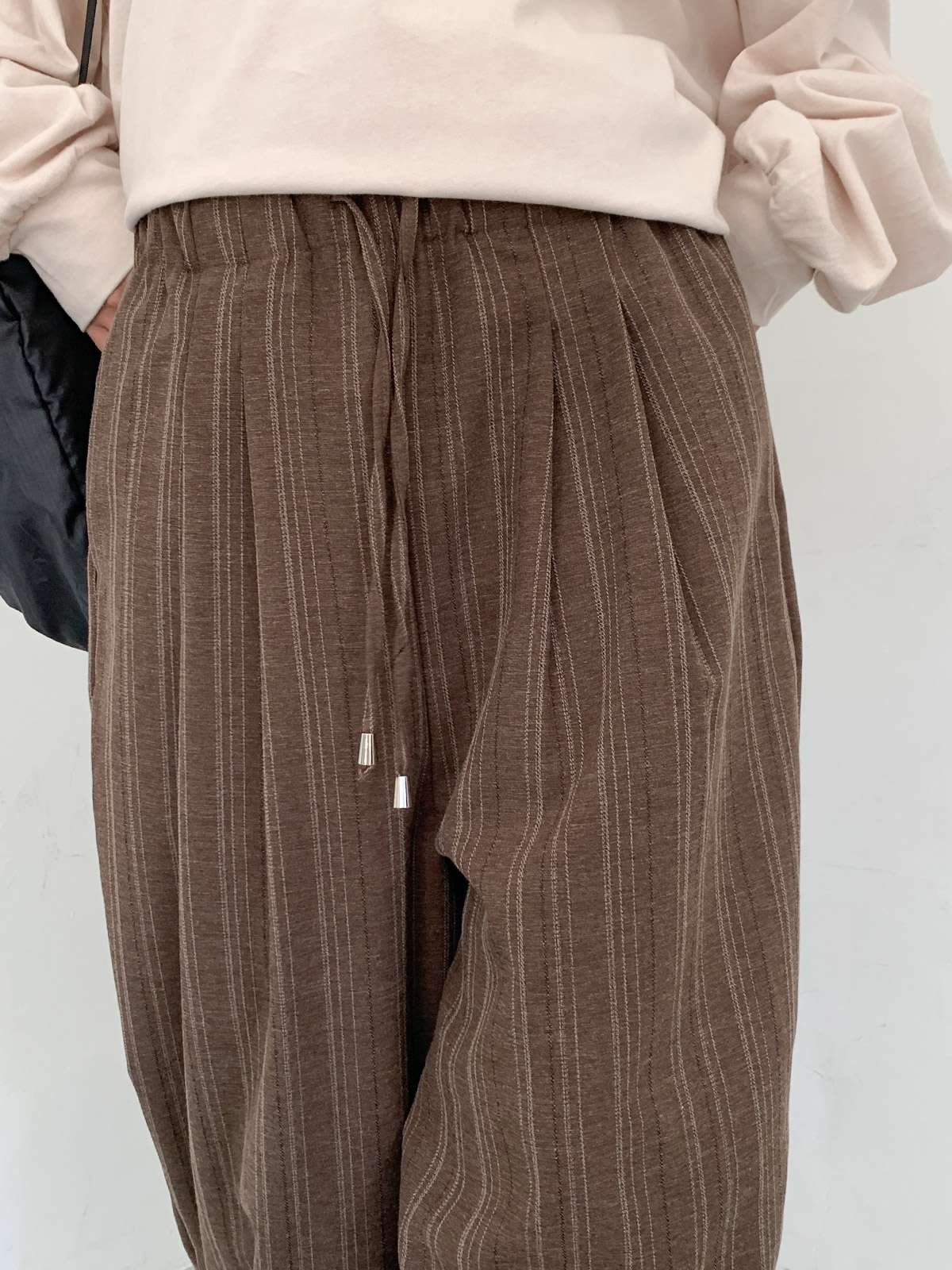 와이드한 핏의 스트라이프 패턴이 포인트인 밴딩 팬츠