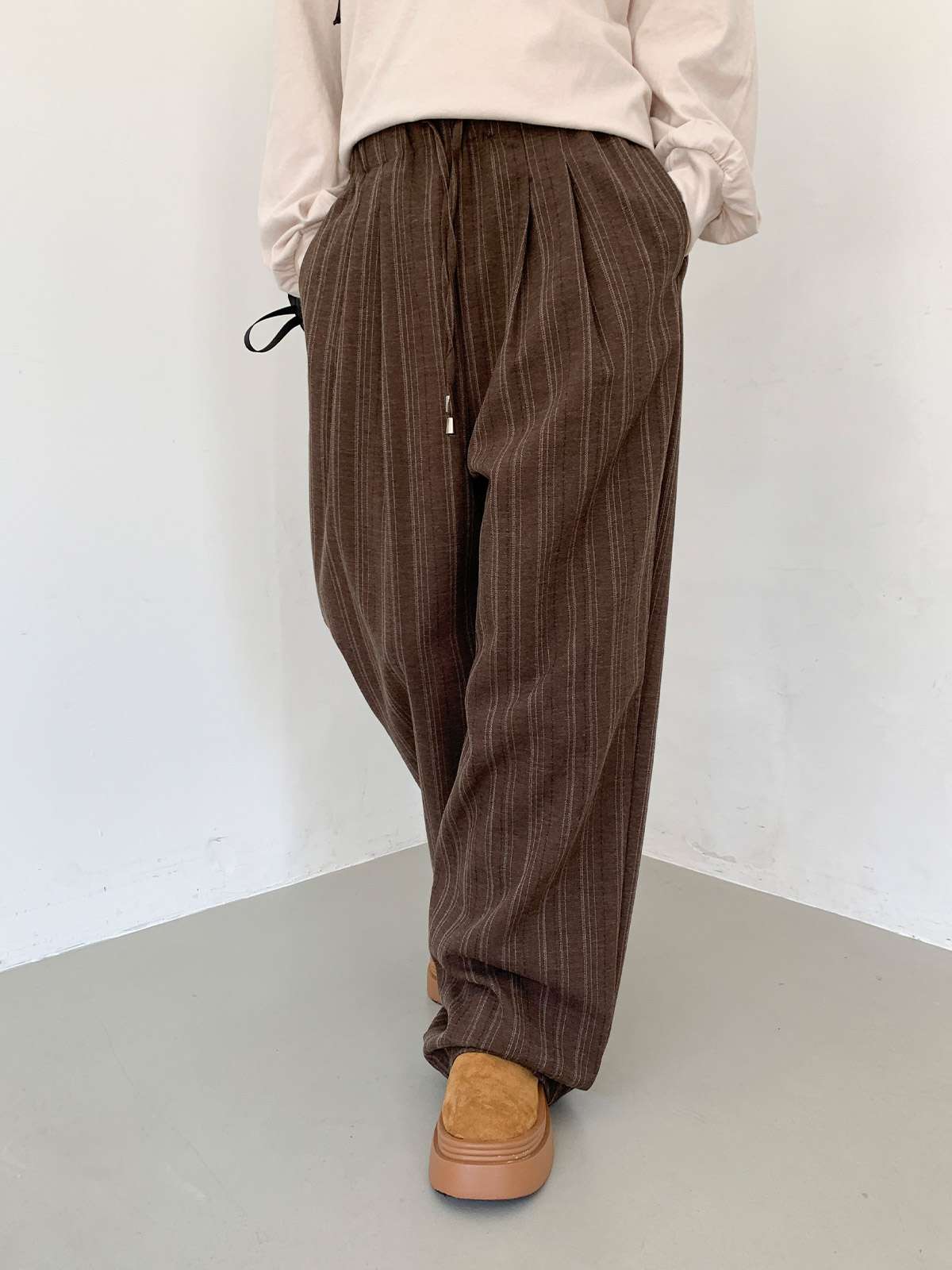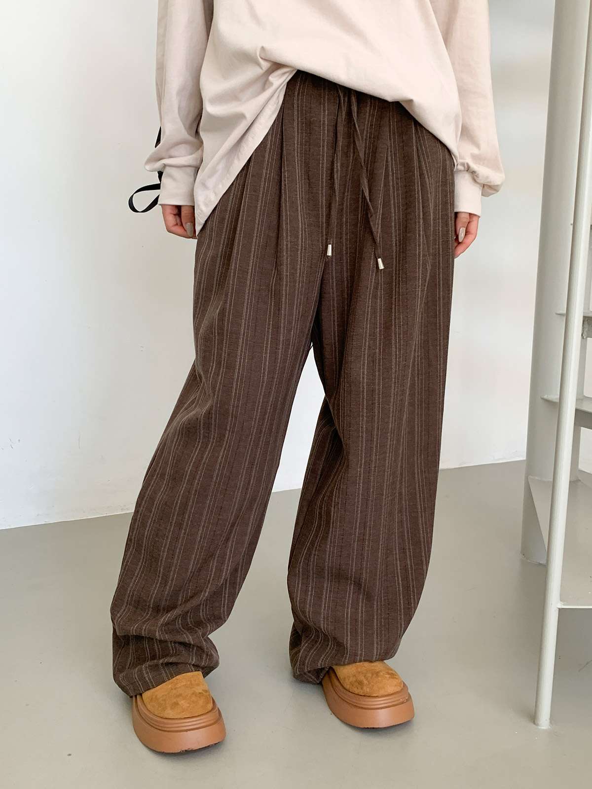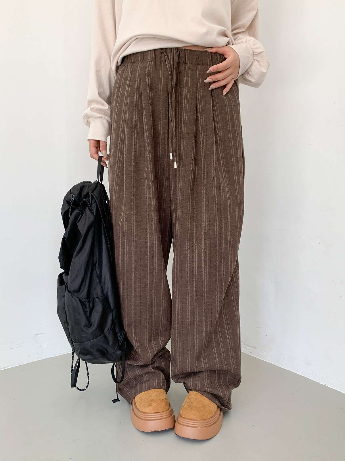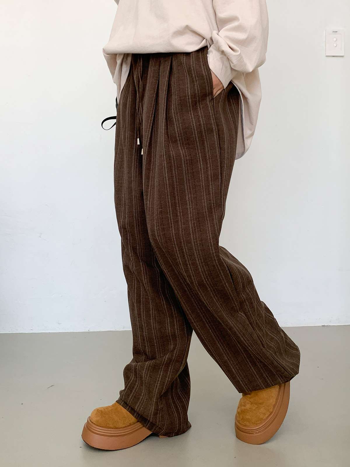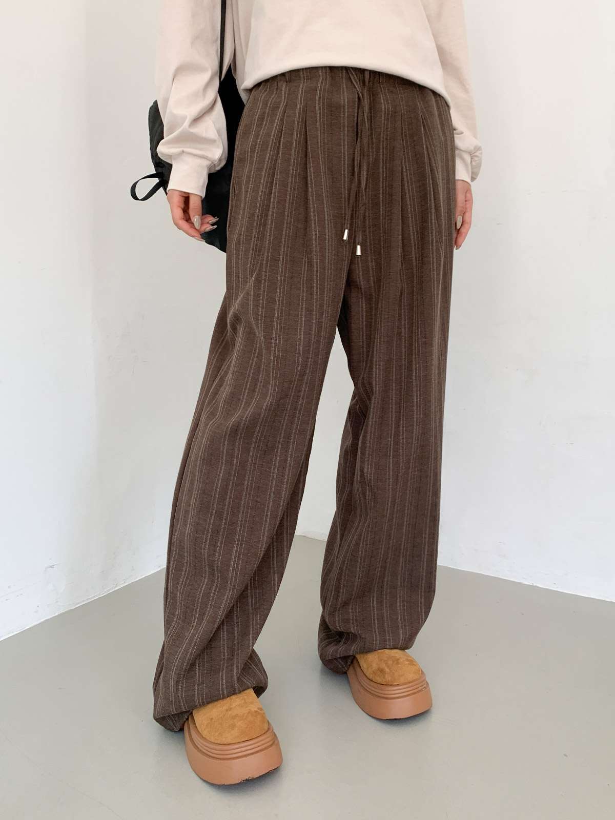 와이드한 핏의 스트라이프 패턴이 포인트인 밴딩 팬츠