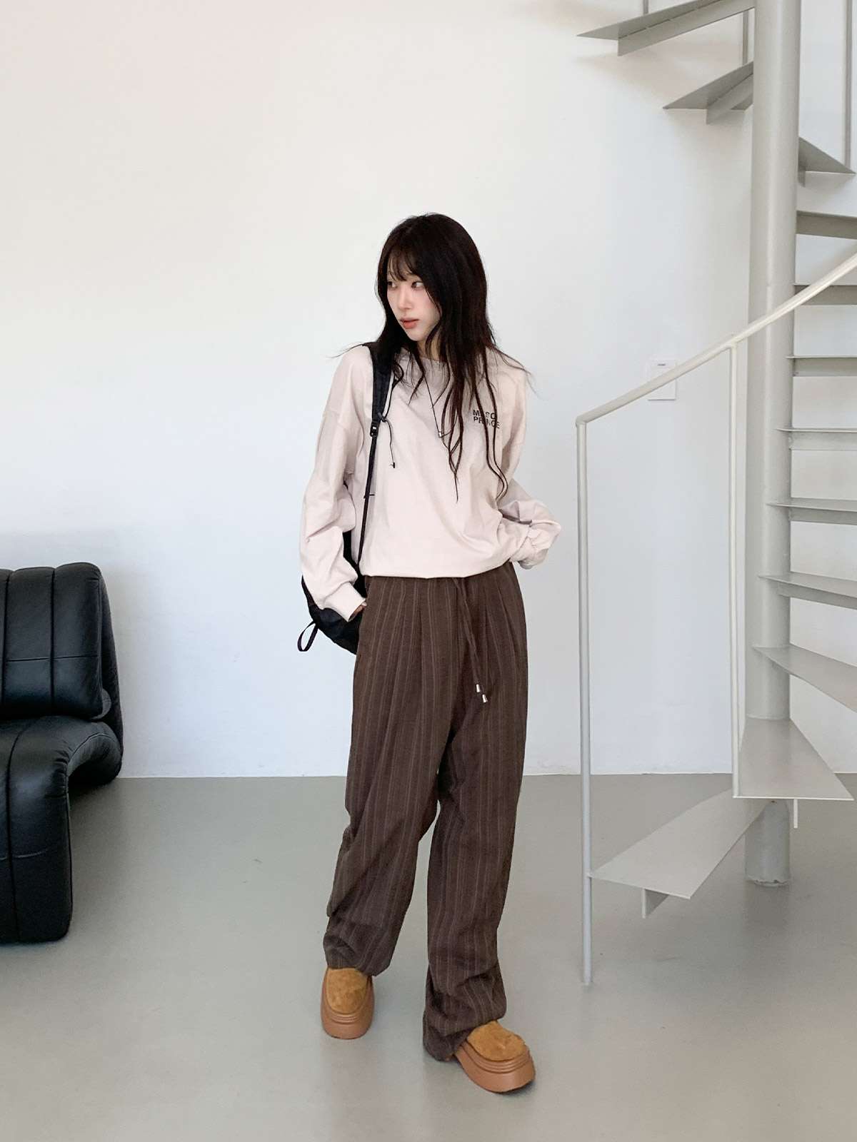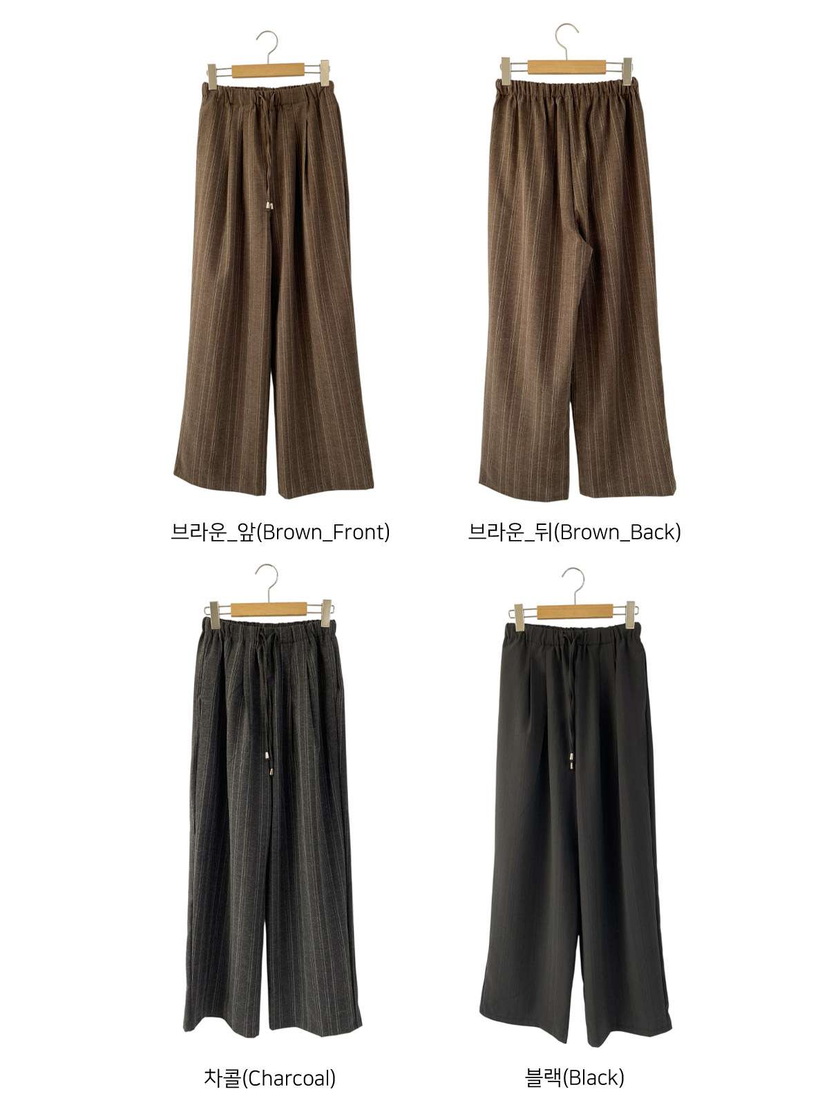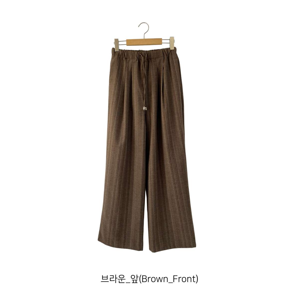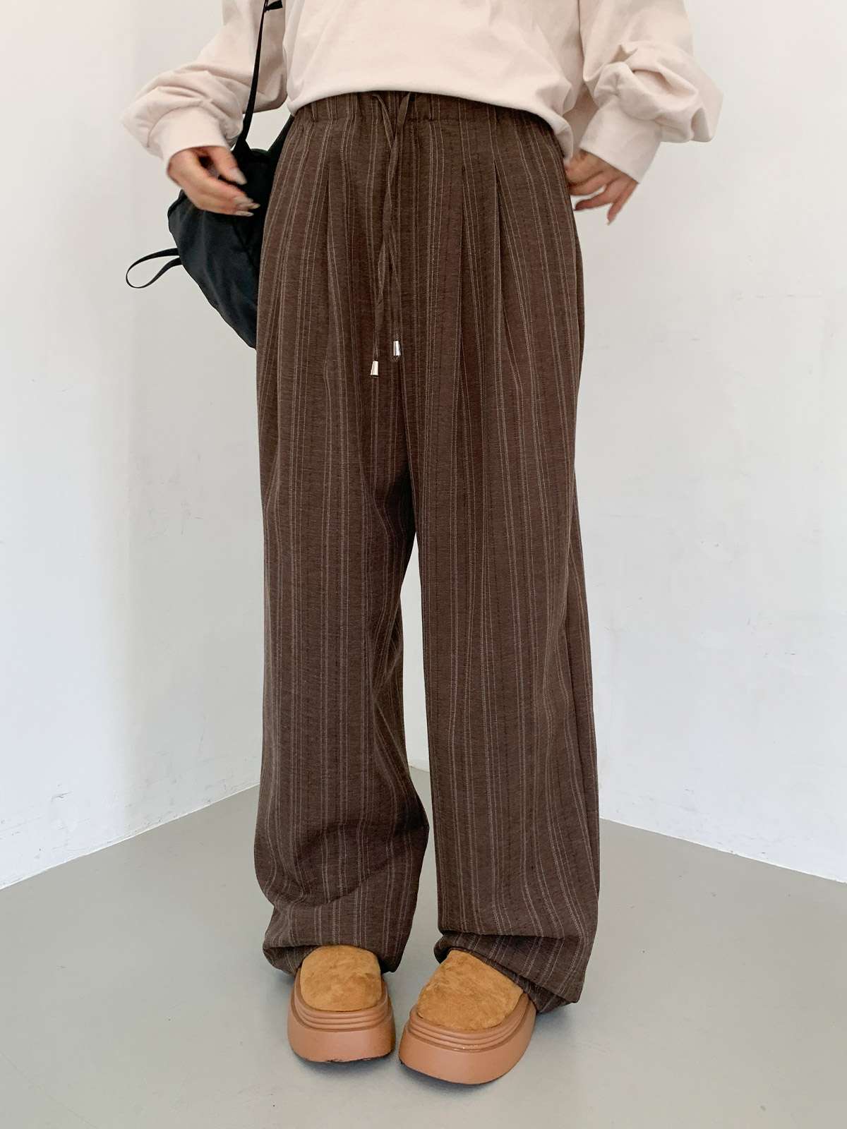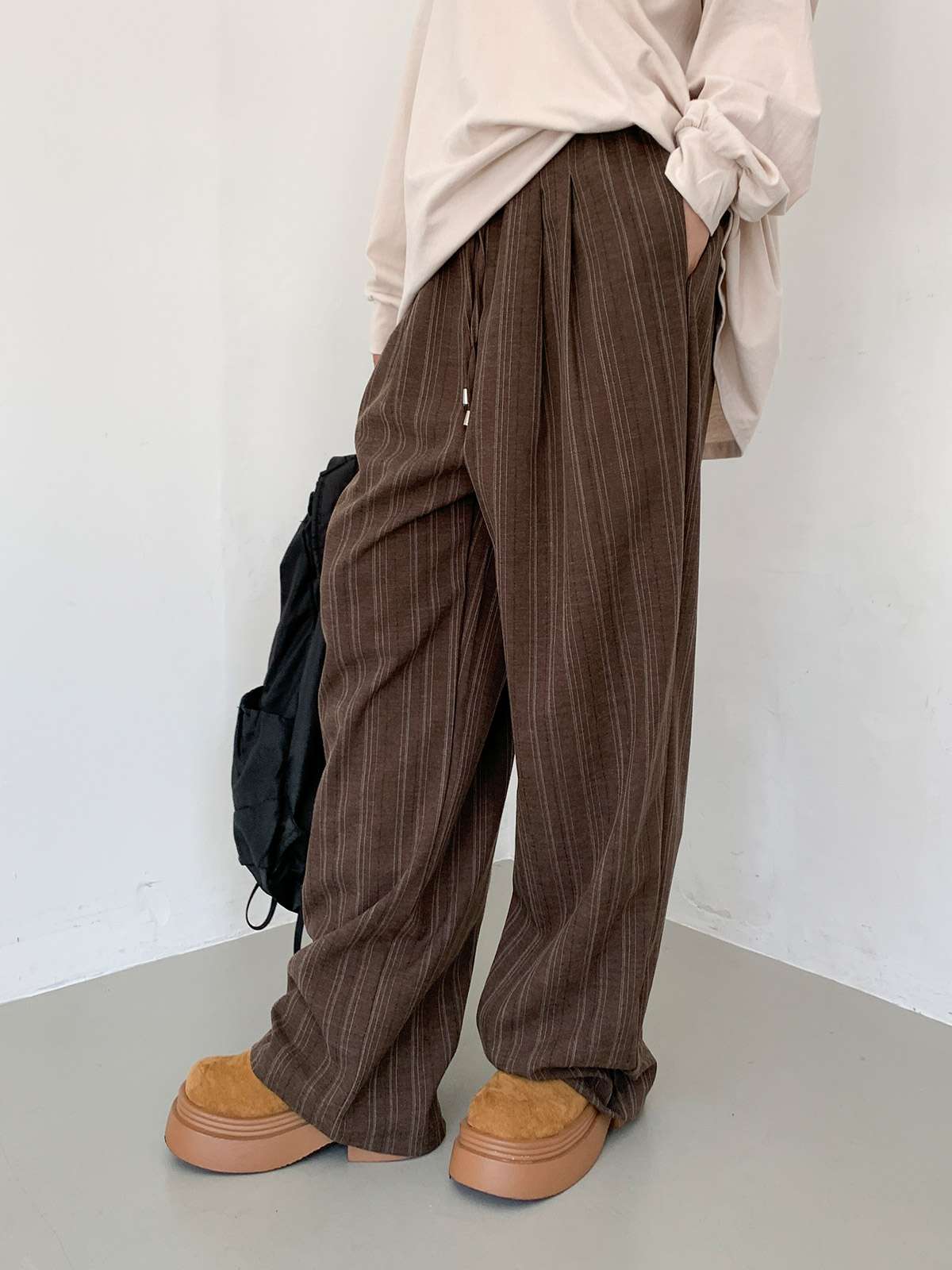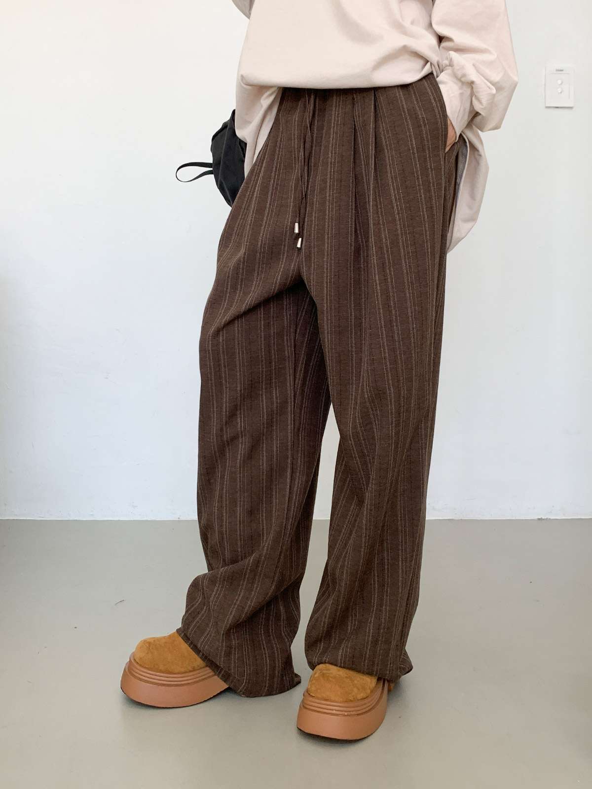 와이드한 핏의 스트라이프 패턴이 포인트인 밴딩 팬츠
