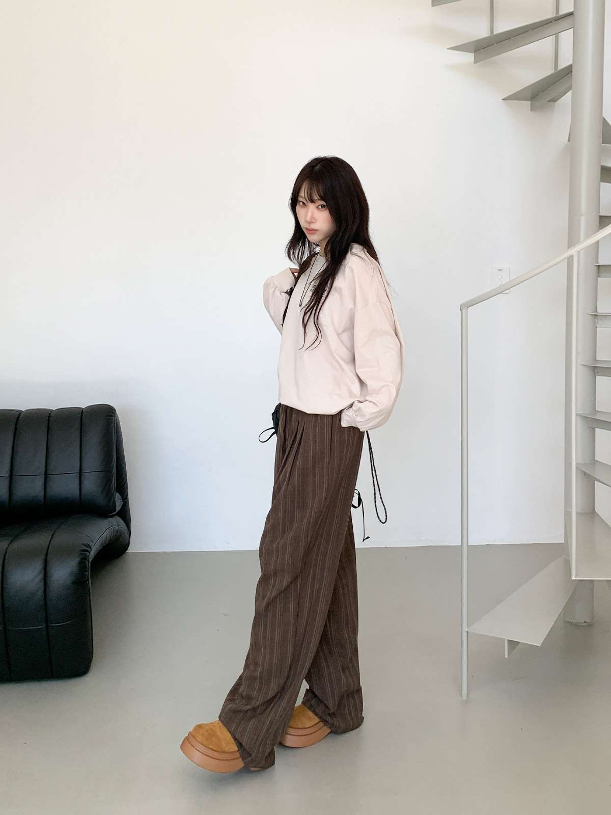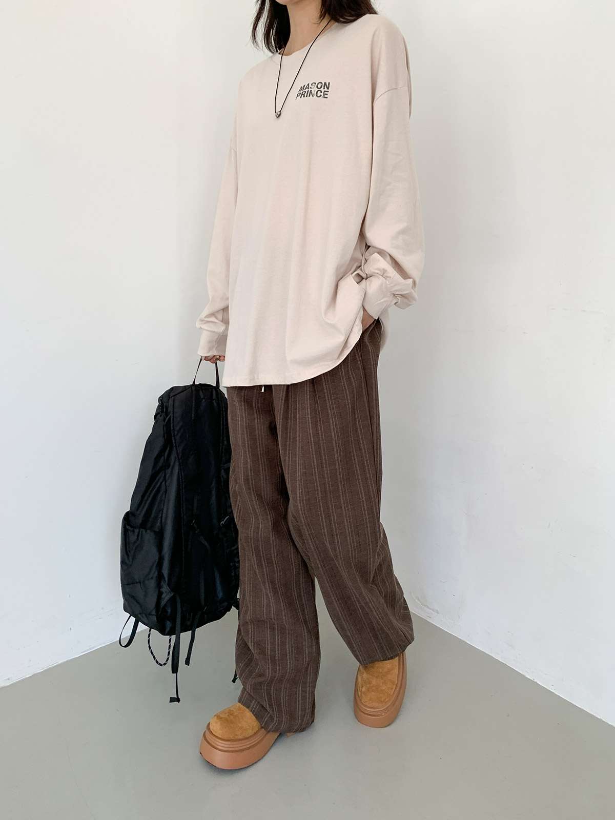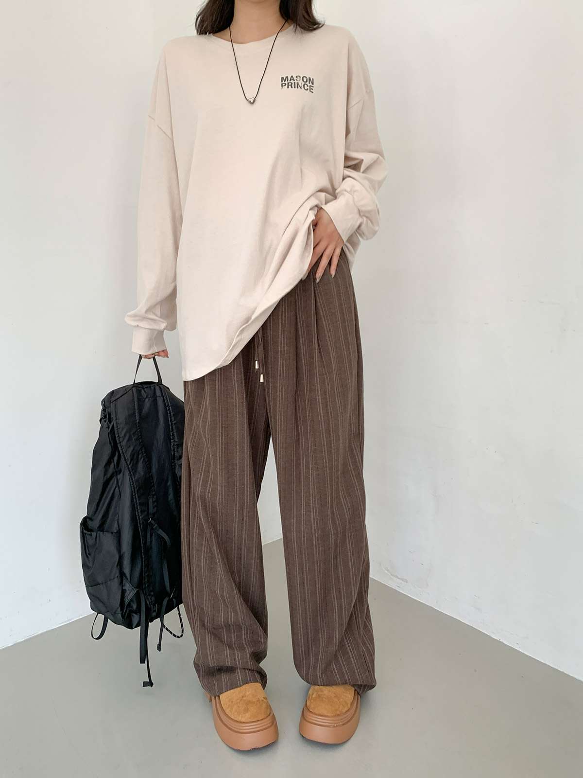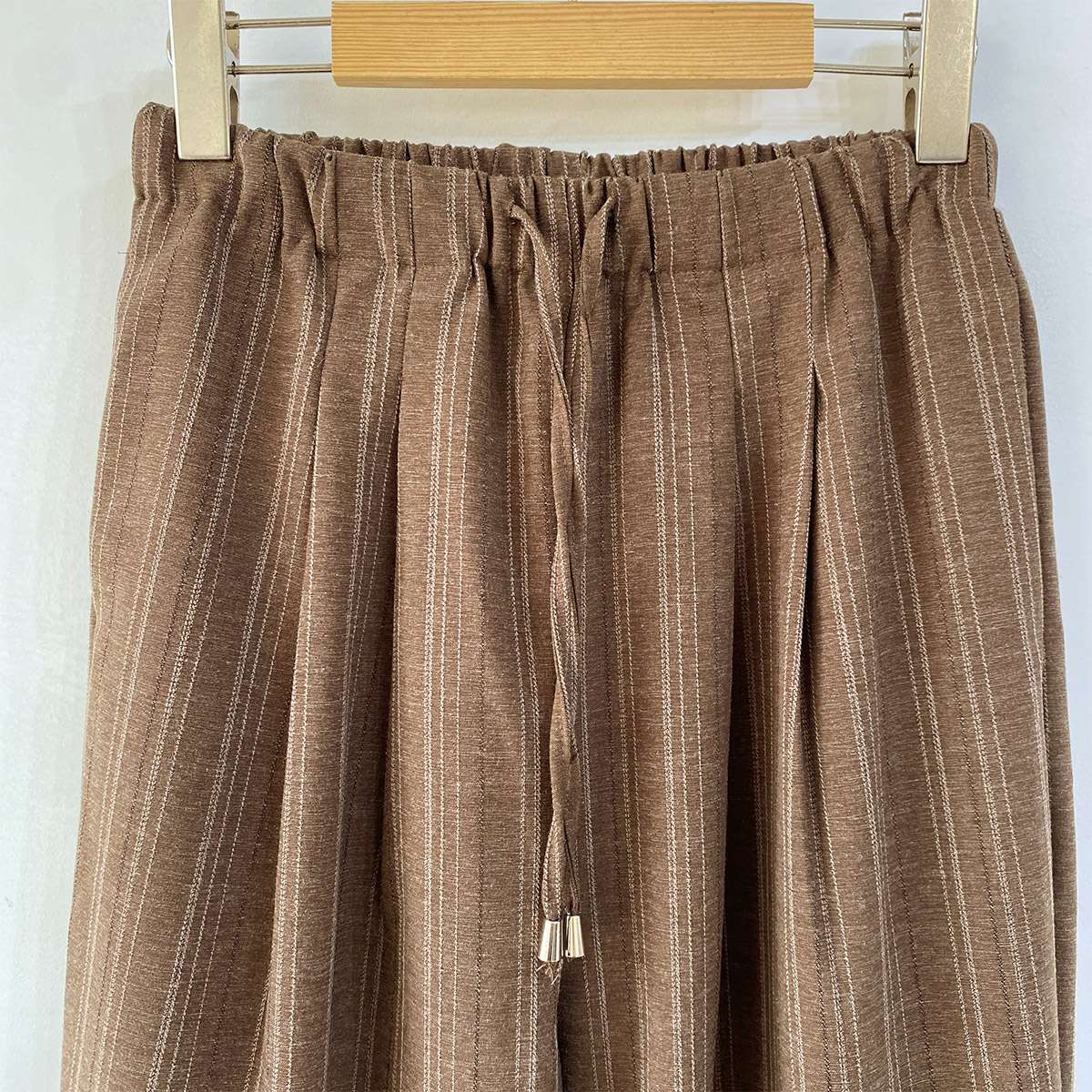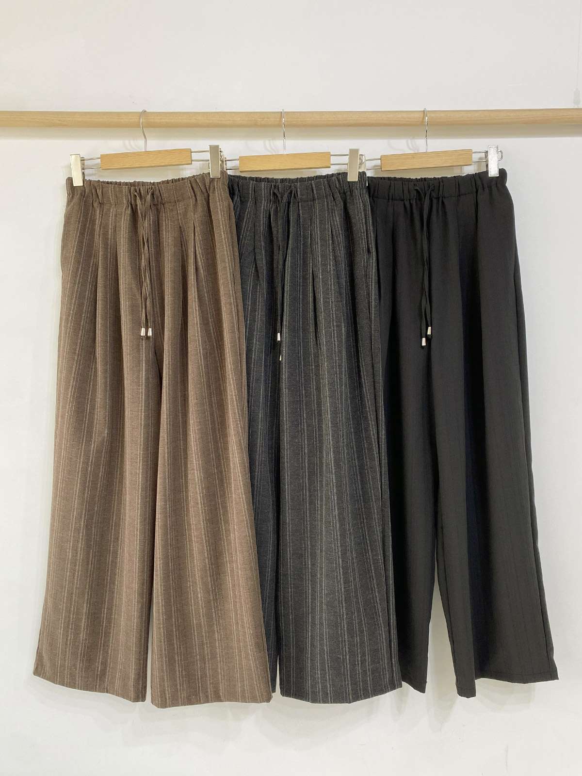 와이드한 핏의 스트라이프 패턴이 포인트인 밴딩 팬츠