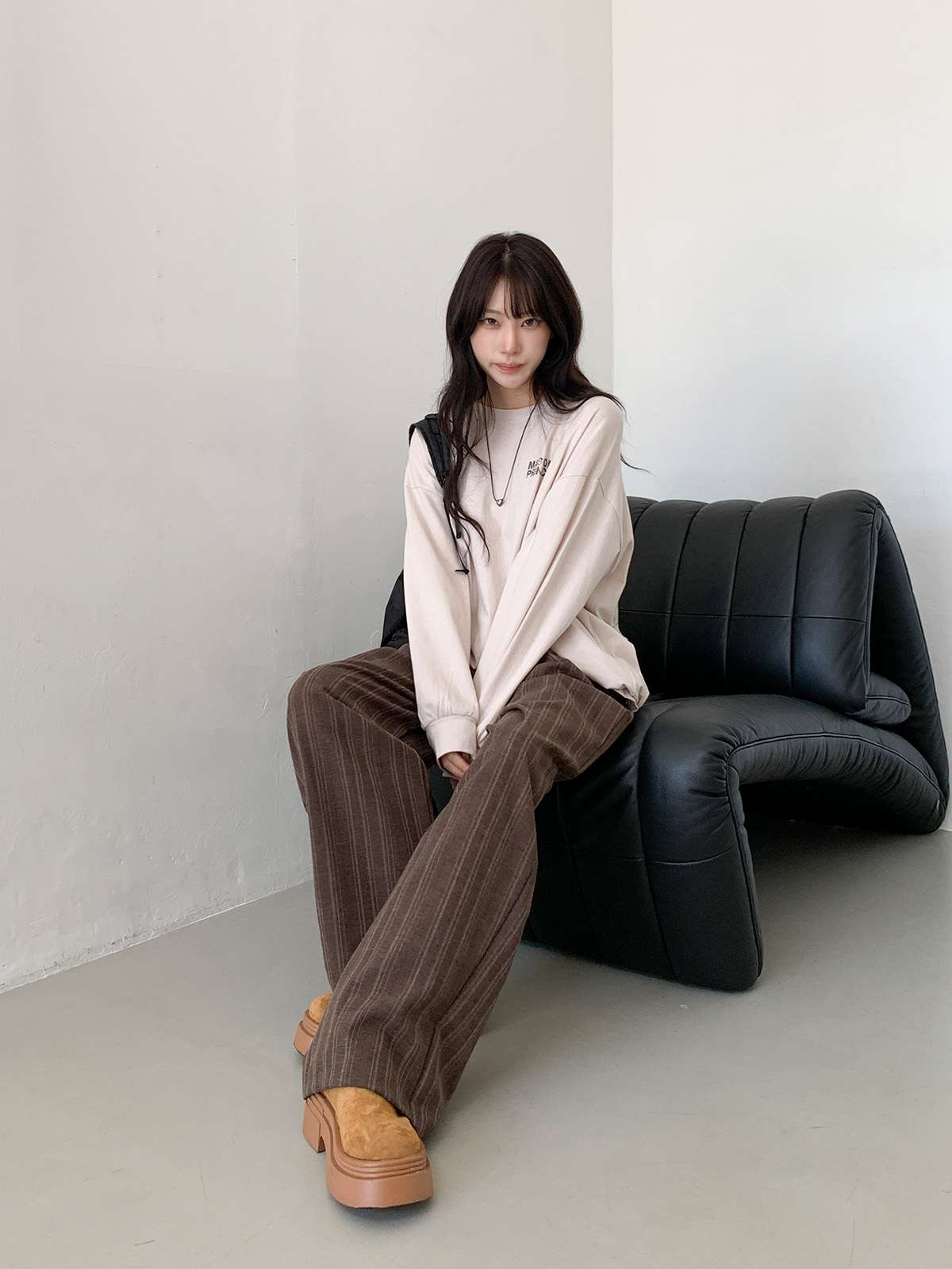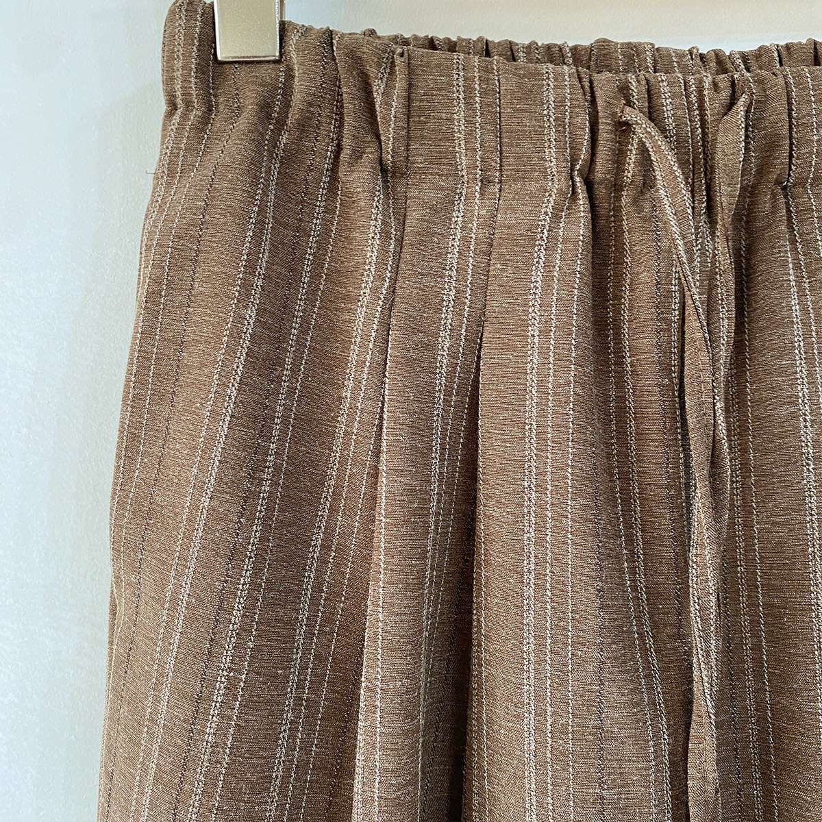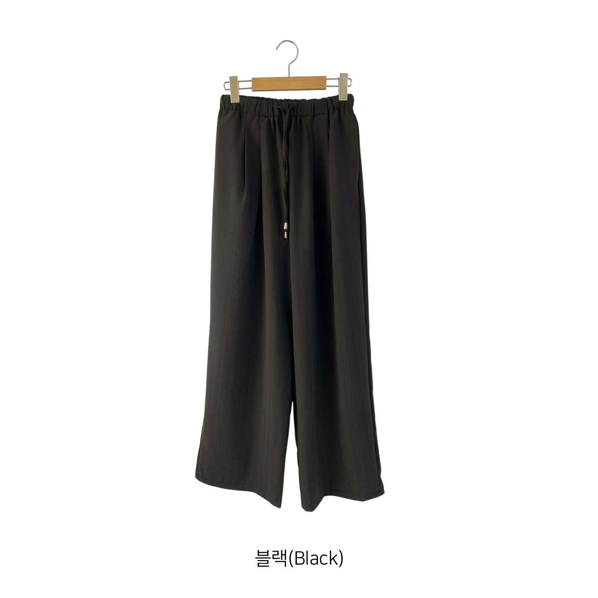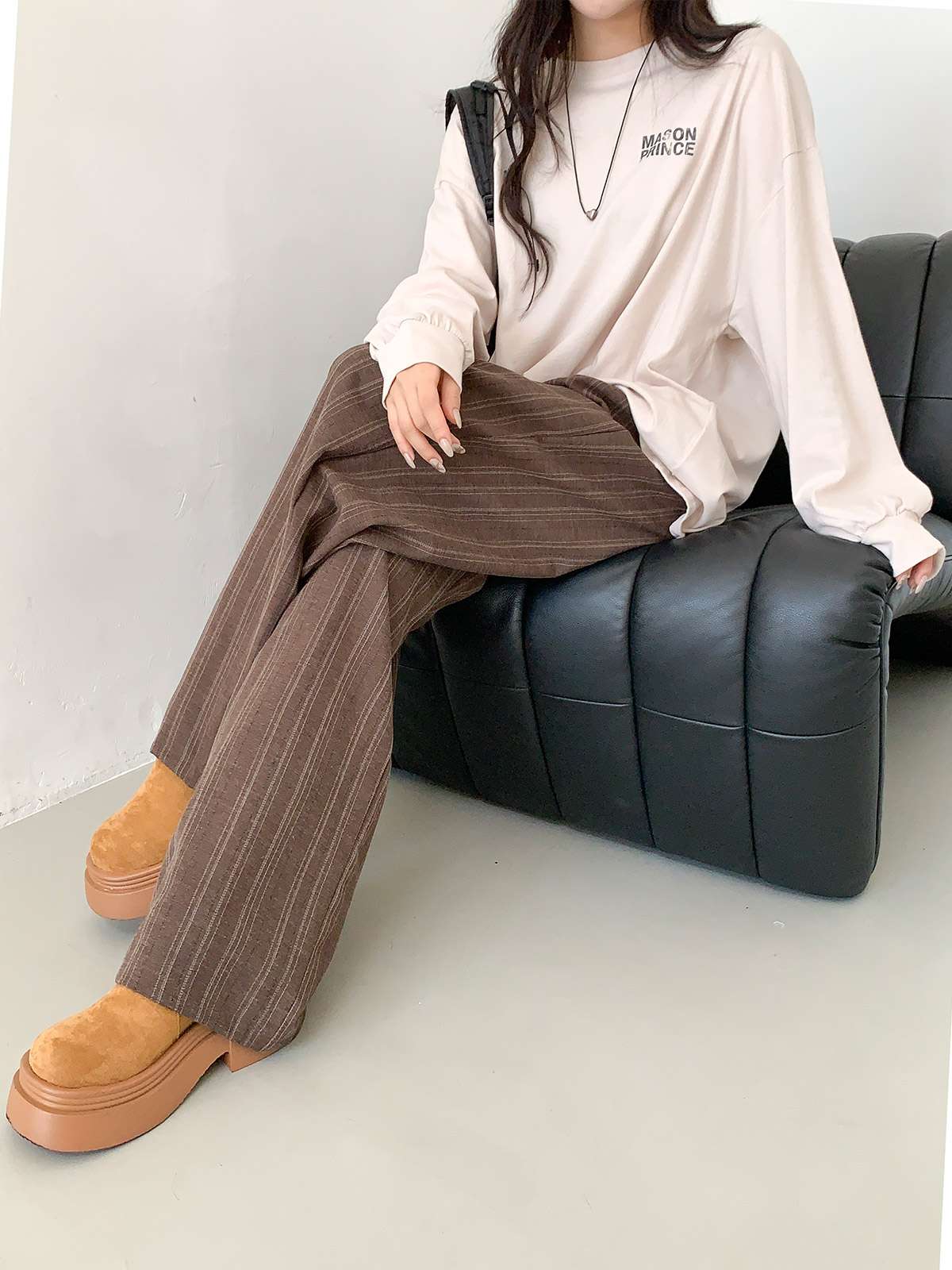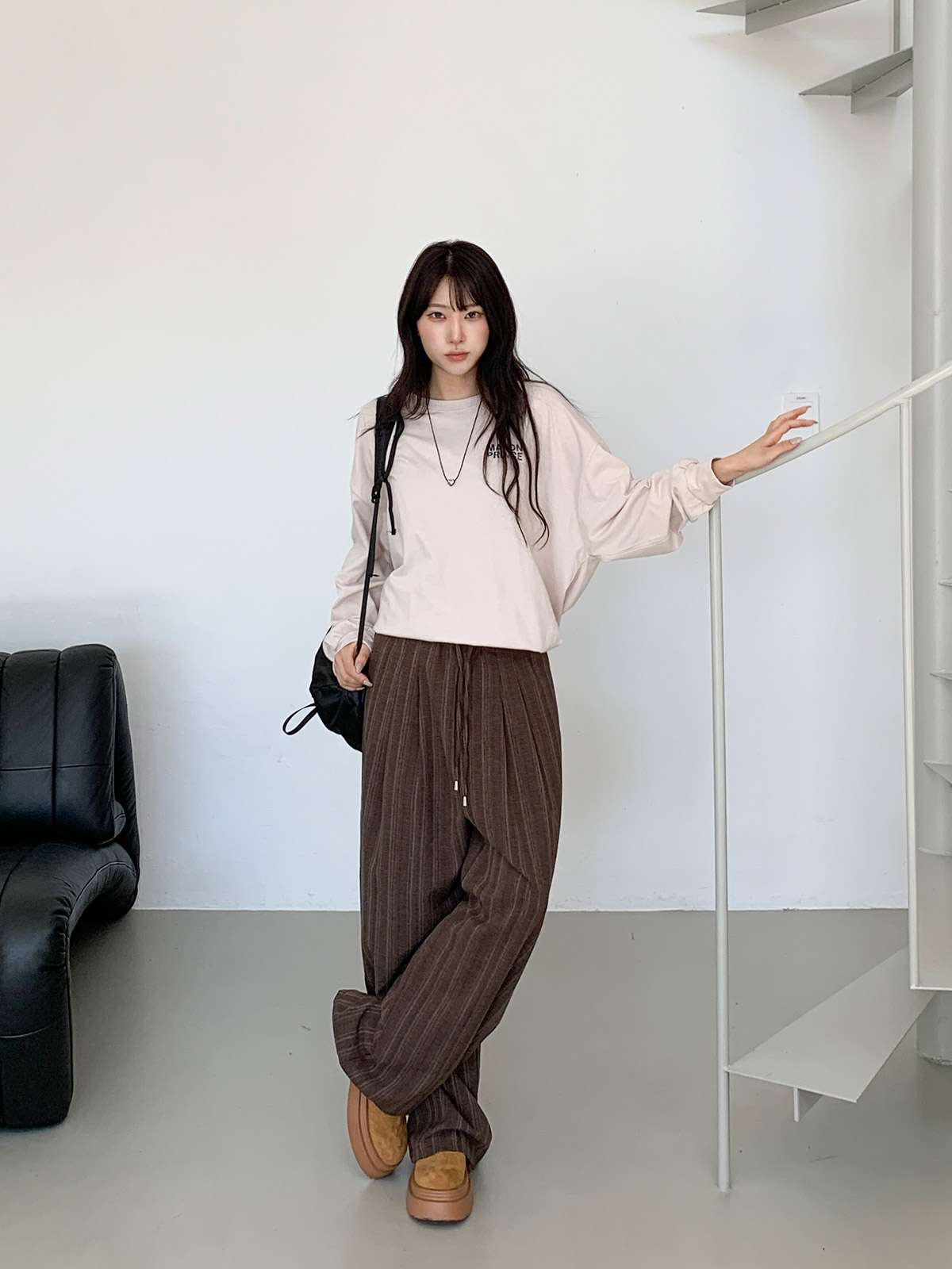 와이드한 핏의 스트라이프 패턴이 포인트인 밴딩 팬츠