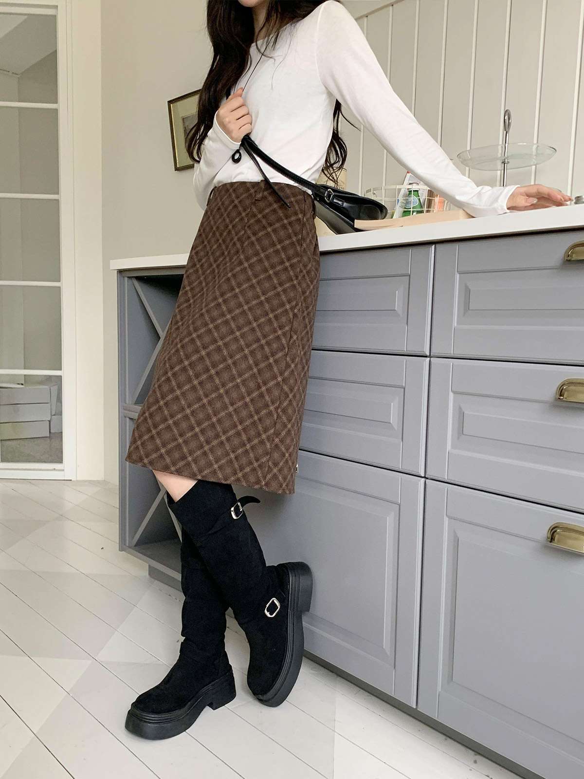 깔끔한 H라인 핏의 체크 패턴이 포인트인 밴딩 미디스커트